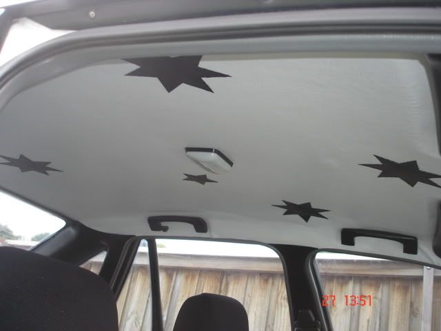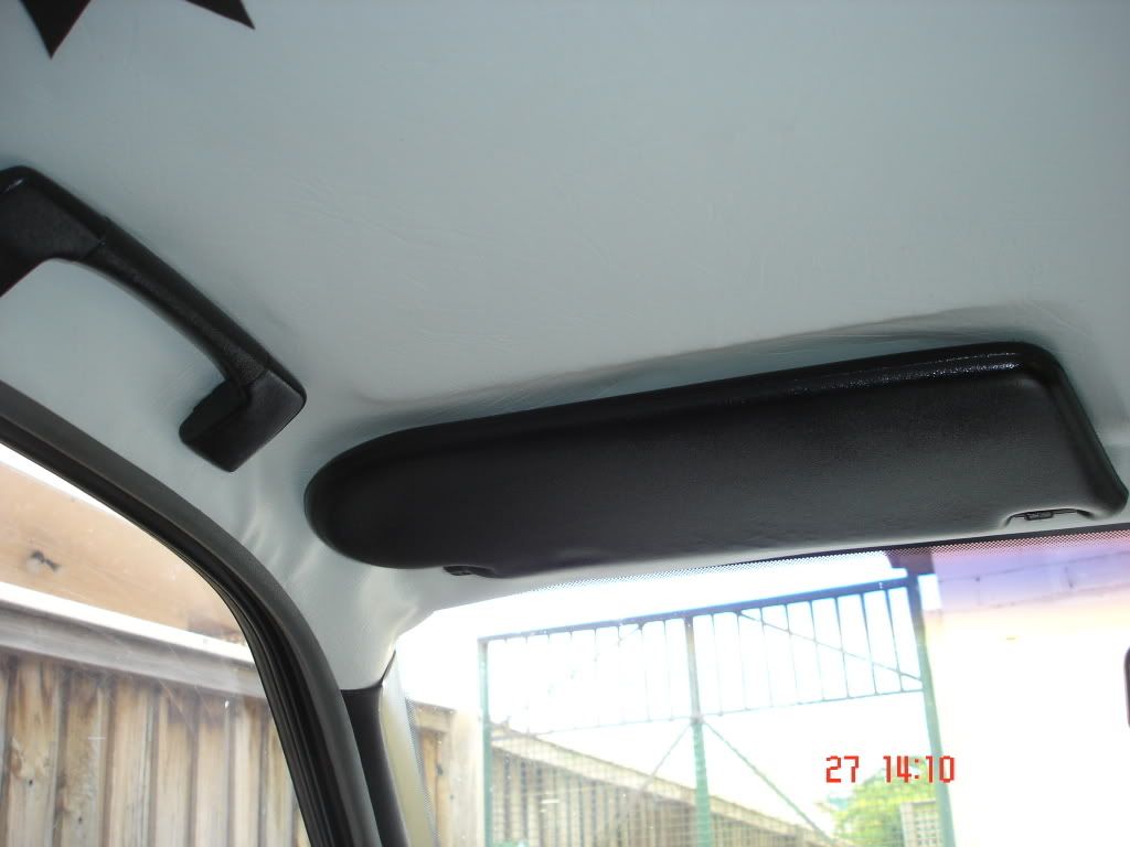 heres my roof lining i did myslef, i also sprayed the plastic covers on the door pillars black and did my fascia and center console to match as well as the sun visors and handles on the roof http://i219.photobucket.com/albums/cc229/jackhammer2388/DSC03083.jpg http://i219.photobucket.com/albums/cc229/jackhammer2388/DSC03087.jpg http://i219.photobucket.com/albums/cc229/jackhammer2388/DSC03088.jpg